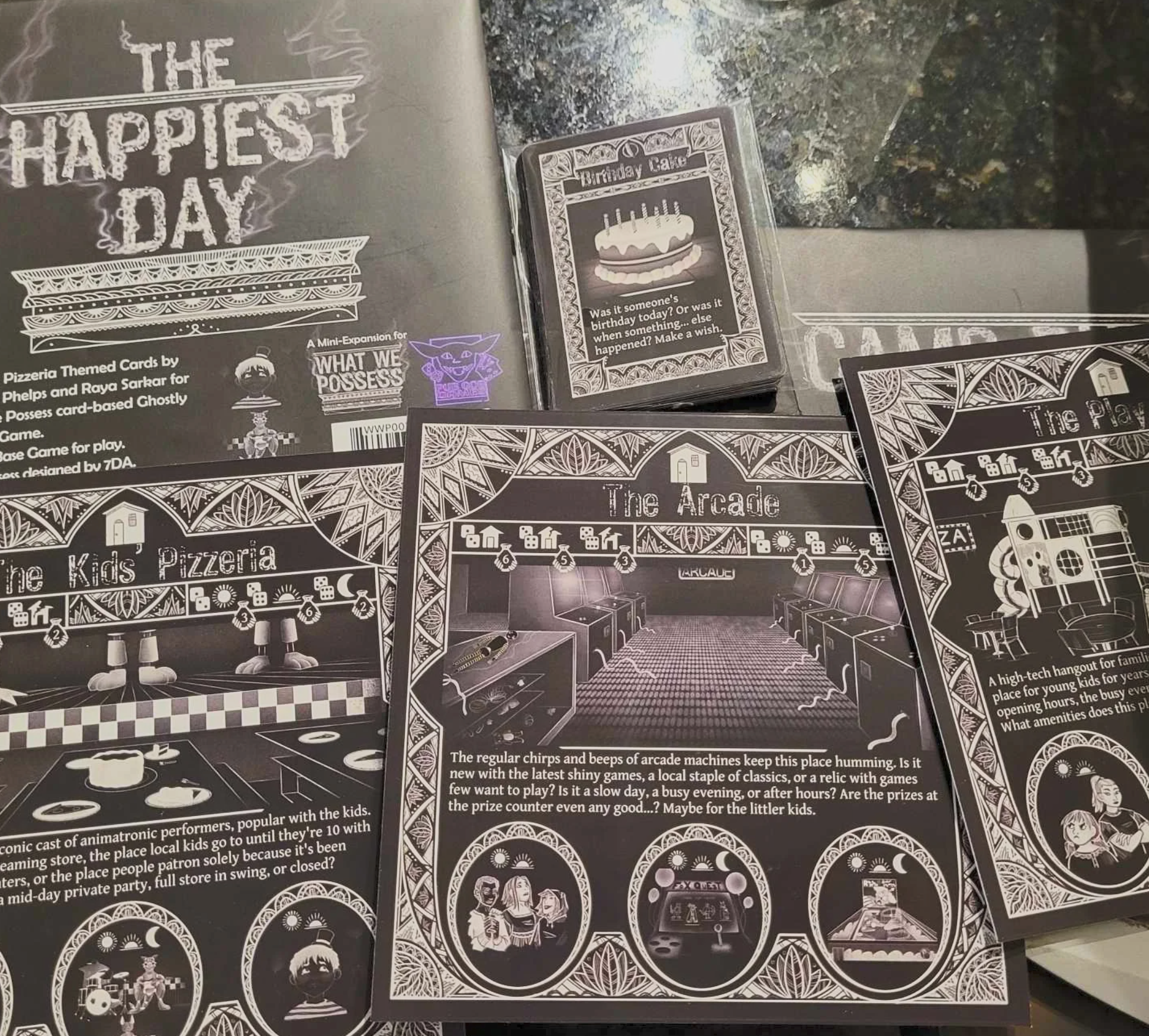 A child’s pizzeria theming, this extra card set is inspired by Five Nights at Freddy’s.