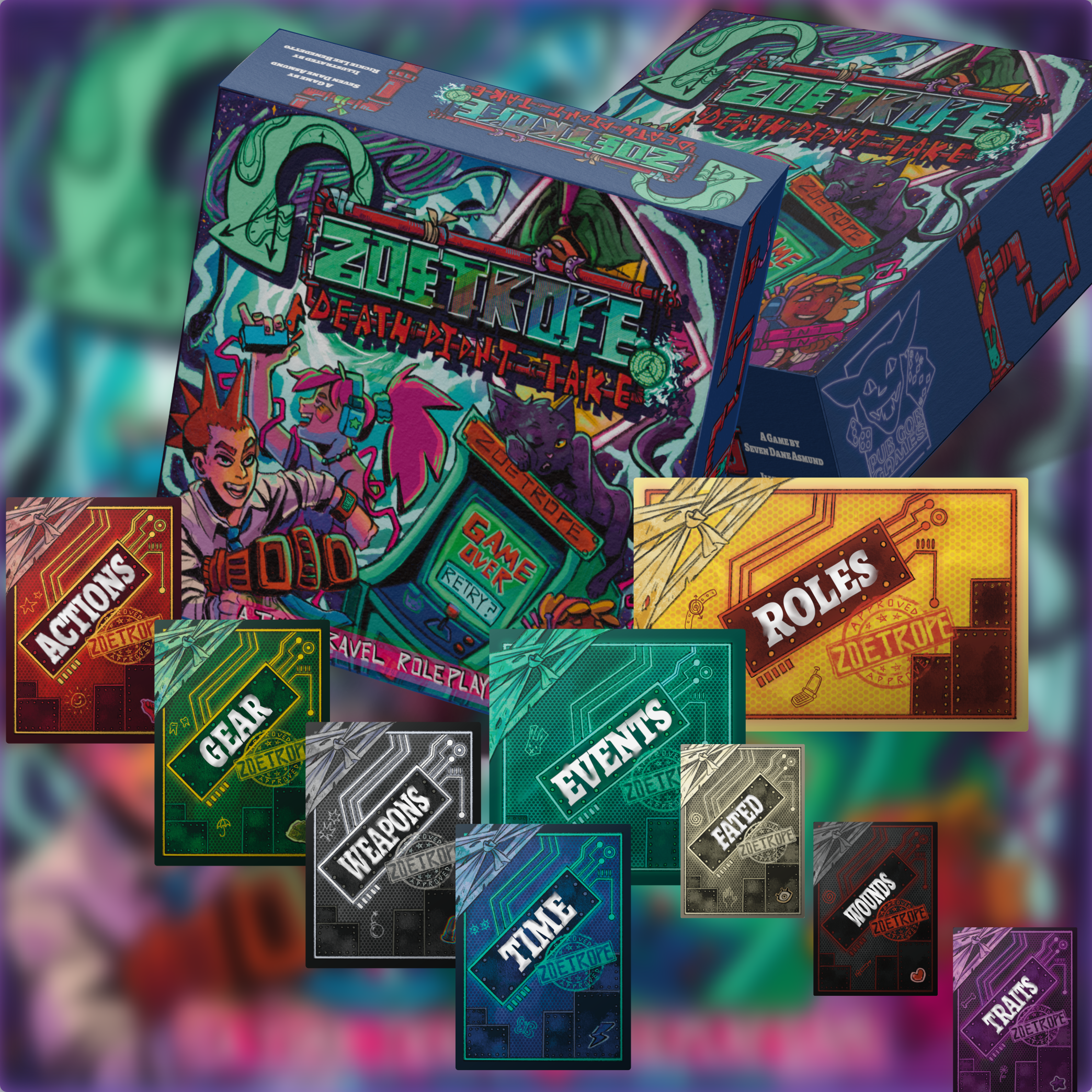 In this second edition of the core table top roleplaying game, ZOETROPE takes your play group on an impromptu time travel journey run on cards. There is no pre-game preparation to do, simply sit down, shuffle the decks, deal out the cards, and get moving on your time travel shenanigans!